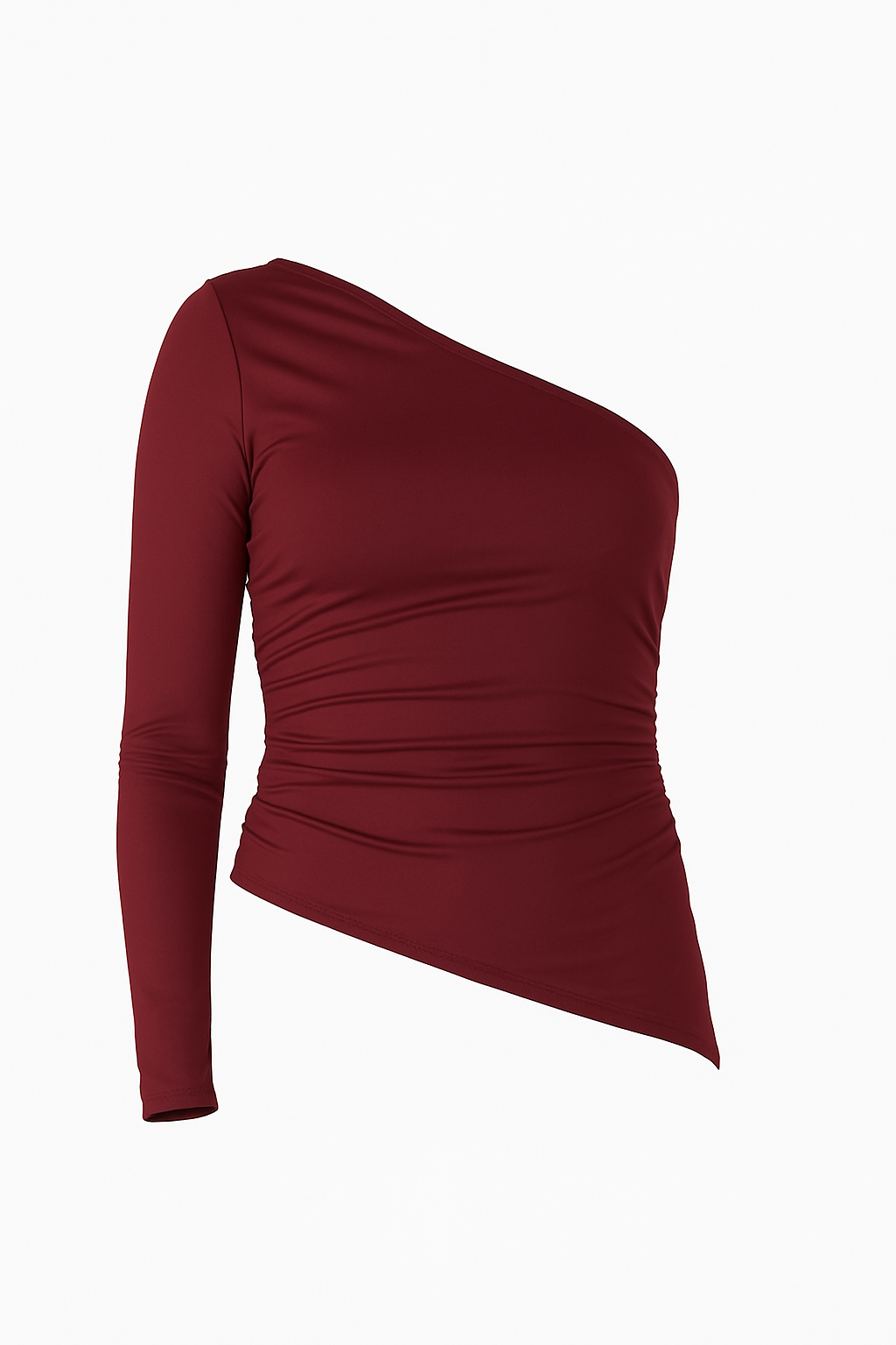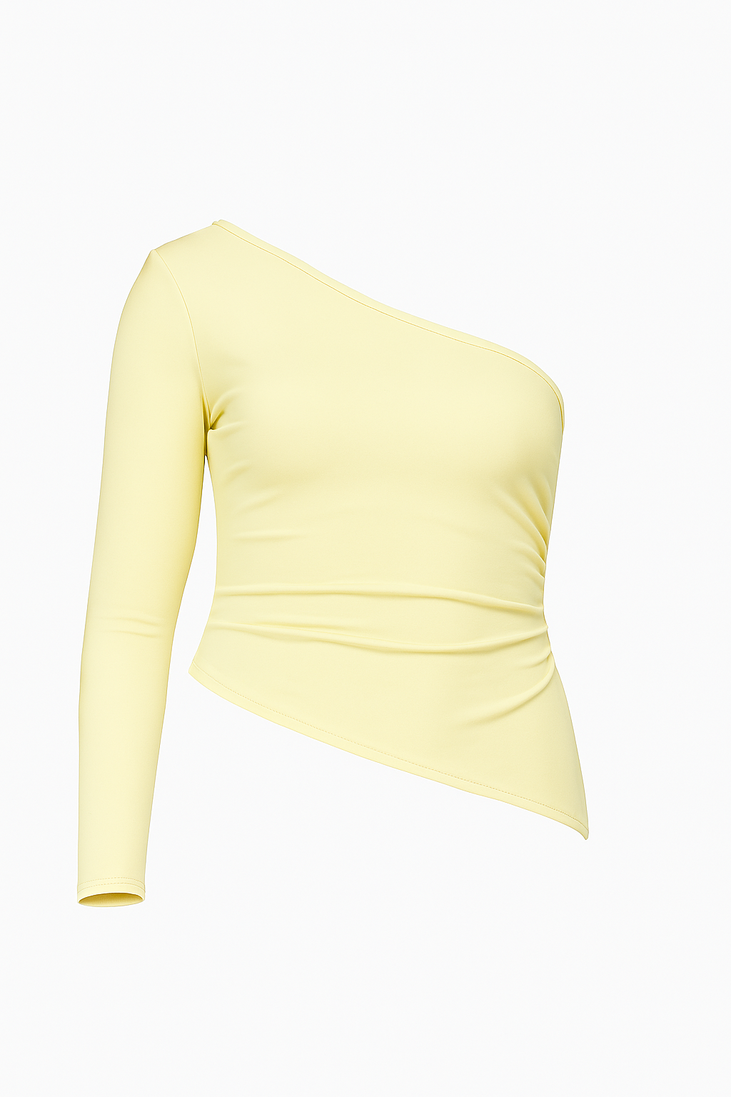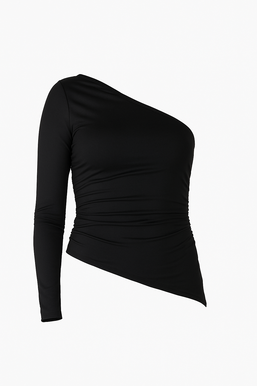 Blusa de silueta ajustada confeccionada en licra poliéster, se adapta cómodamente al cuerpo. Diseño asimétrico de un solo hombro con una manga larga, ideal para un look moderno y estilizado. Presenta frunces laterales que aportan textura y favorecen visualmente la figura, creando un efecto de ajuste natural. Terminación limpia en el ruedo para un acabado pulido.
