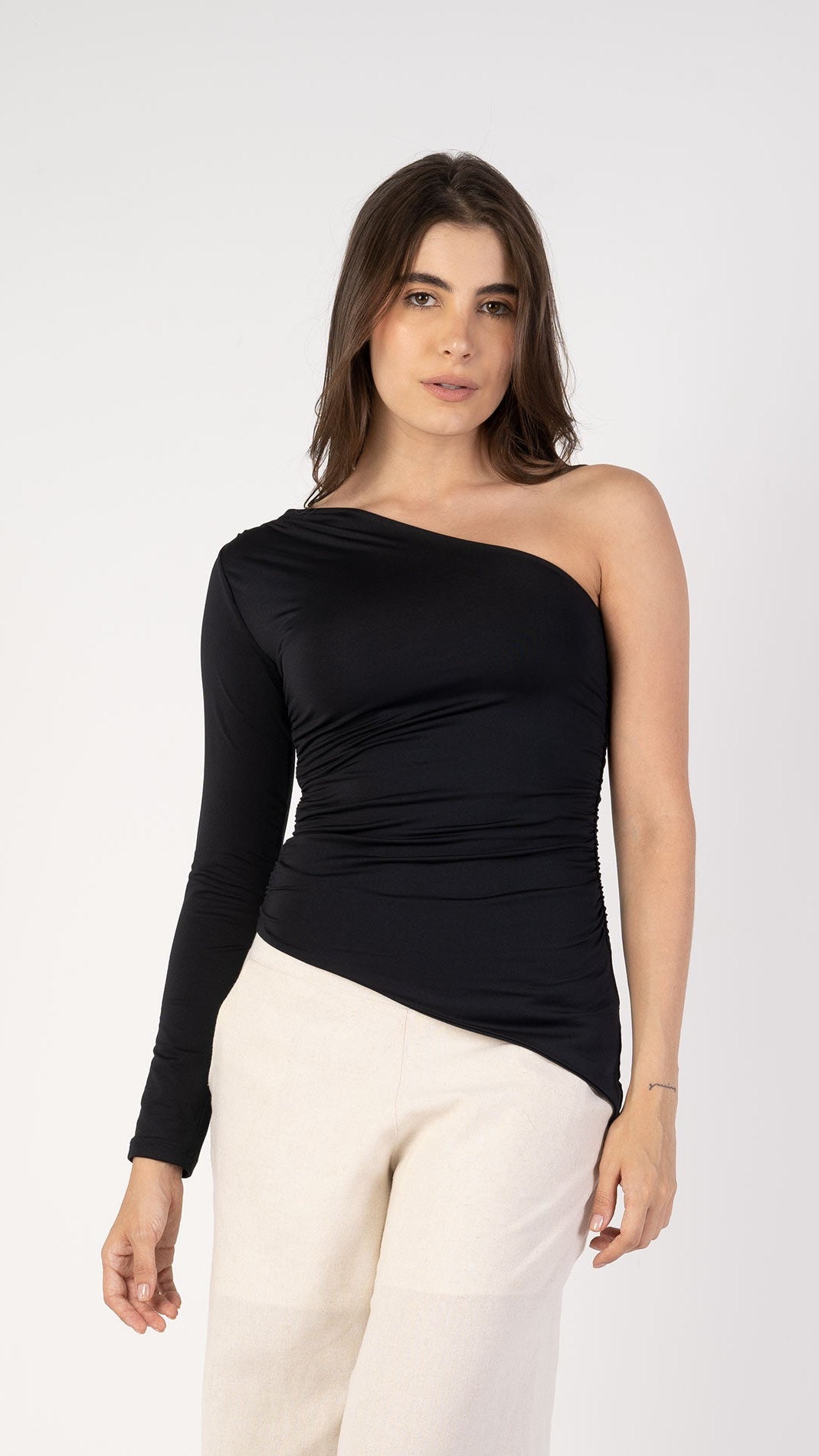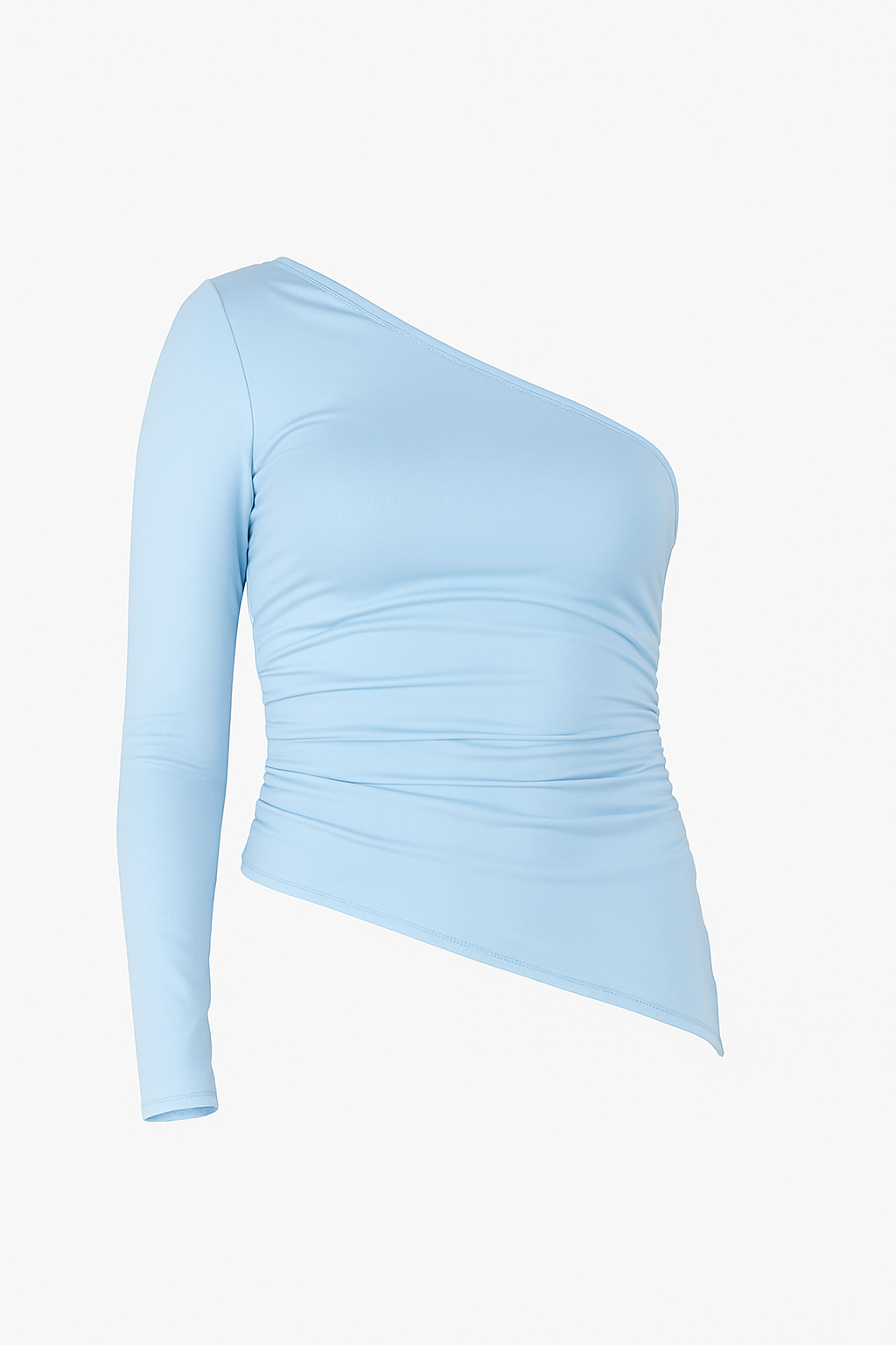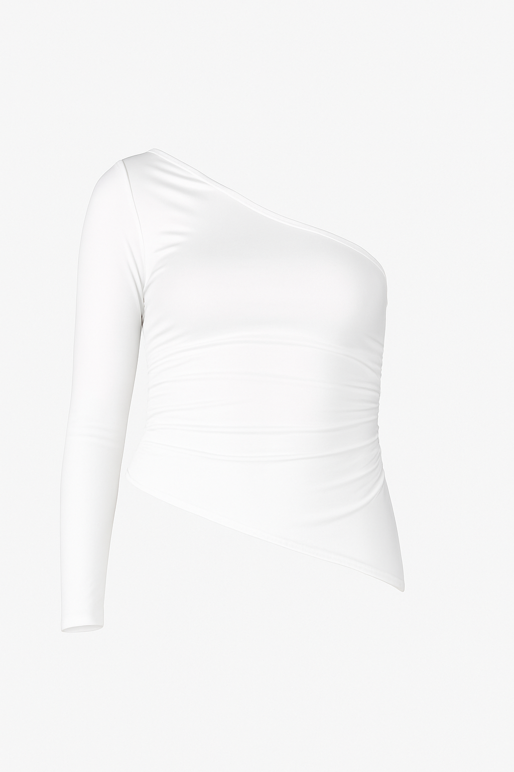 Blusa de silueta ajustada confeccionada en licra poliéster, se adapta cómodamente al cuerpo. Diseño asimétrico de un solo hombro con una manga larga, ideal para un look moderno y estilizado. Presenta frunces laterales que aportan textura y favorecen visualmente la figura, creando un efecto de ajuste natural. Terminación limpia en el ruedo para un acabado pulido.