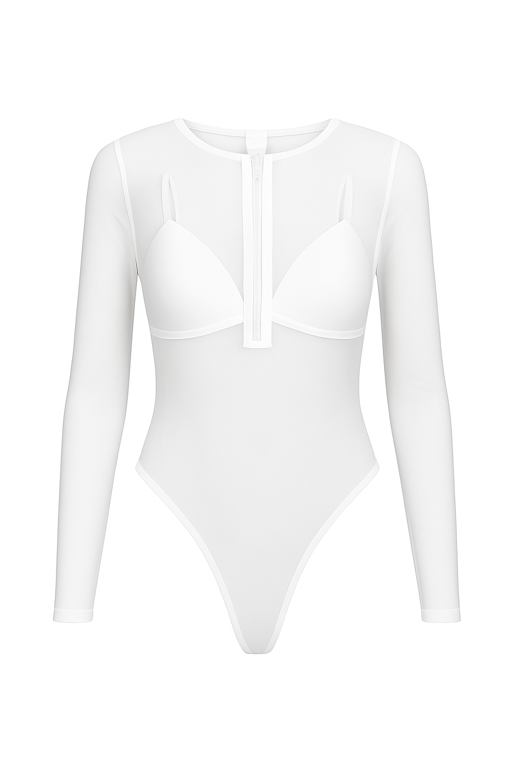 Body confeccionado en malla translúcida con top interno en licra para mayor cobertura y soporte. Presenta cuello alto con cremallera frontal funcional y mangas largas ajustadas. La parte inferior es tipo tanga con abrochadura ajustable, garantizando un ajuste cómodo y seguro. incluye el TOP BEBE.