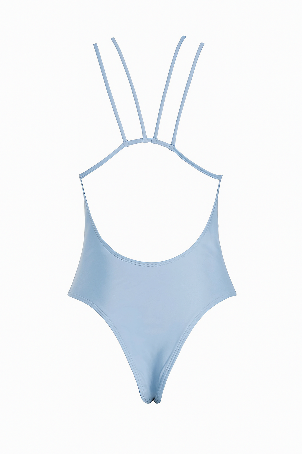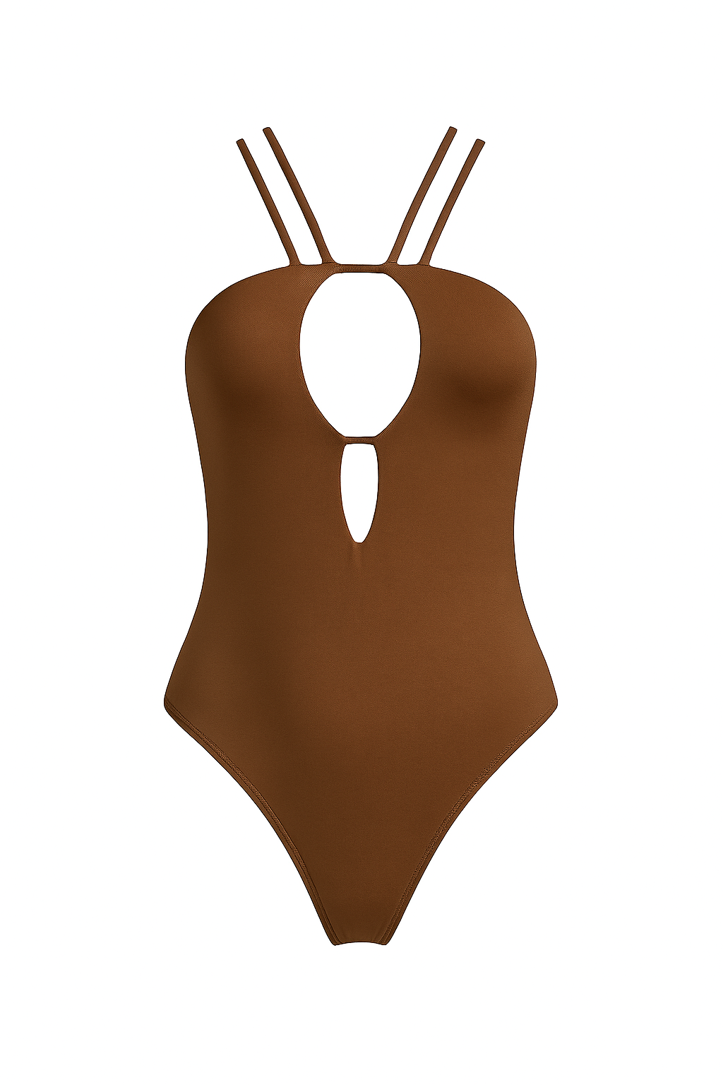Body confeccionado en licra poliéster con acabado suave y de alta elongación. Diseño con escote corazón y doble abertura frontal tipo lágrima que enmarca el busto de forma elegante y femenina. Tirantes dobles ajustables que cruzan en la parte posterior, aportando un toque moderno y seguro. Silueta limpia, de inspiración minimalista, con parte inferior tipo tanga y broche ajustable para un ajuste cómodo.