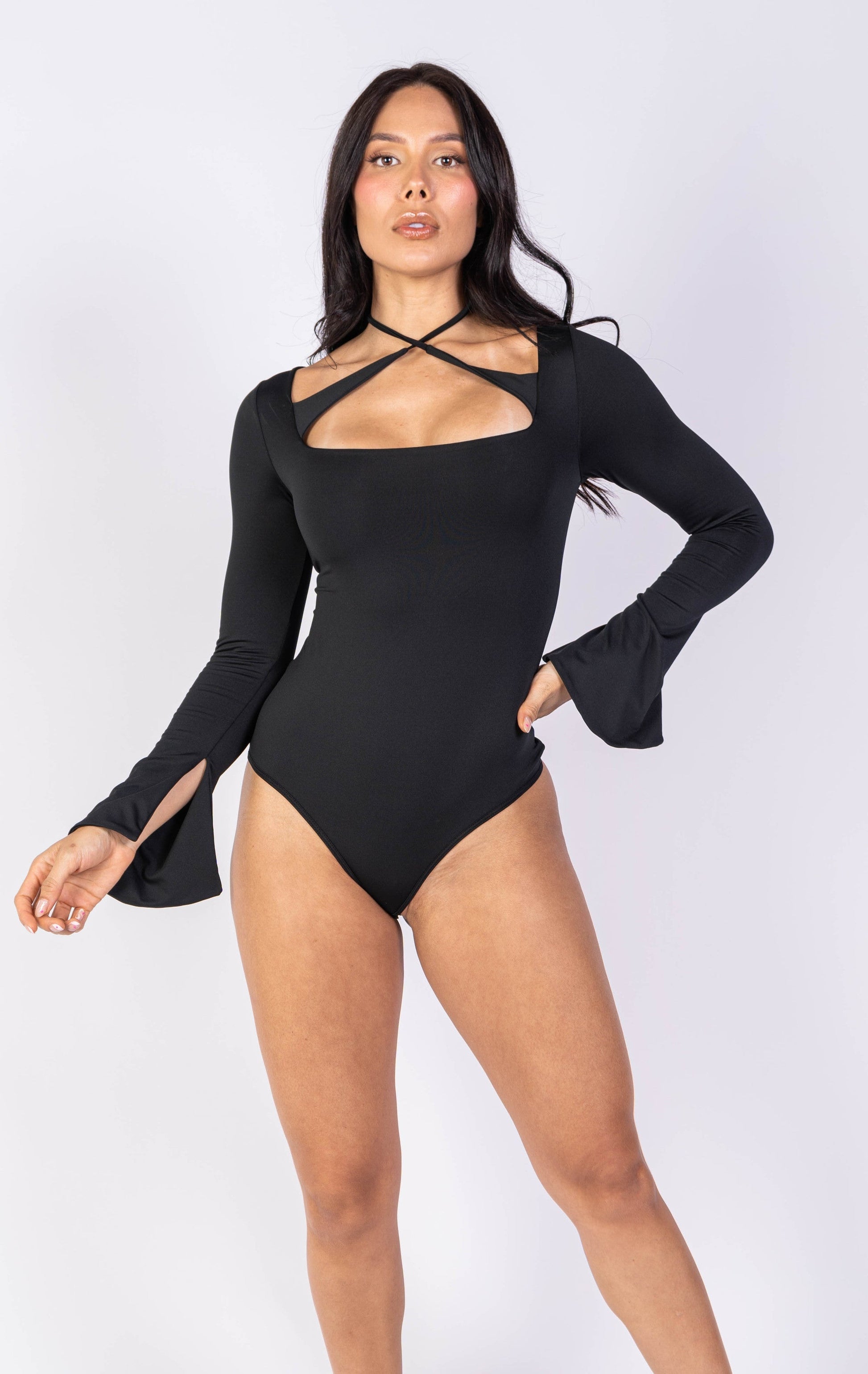 Body de mangas largas tipo campana con escote cuadrado y tiras envolventes en el cuello.
