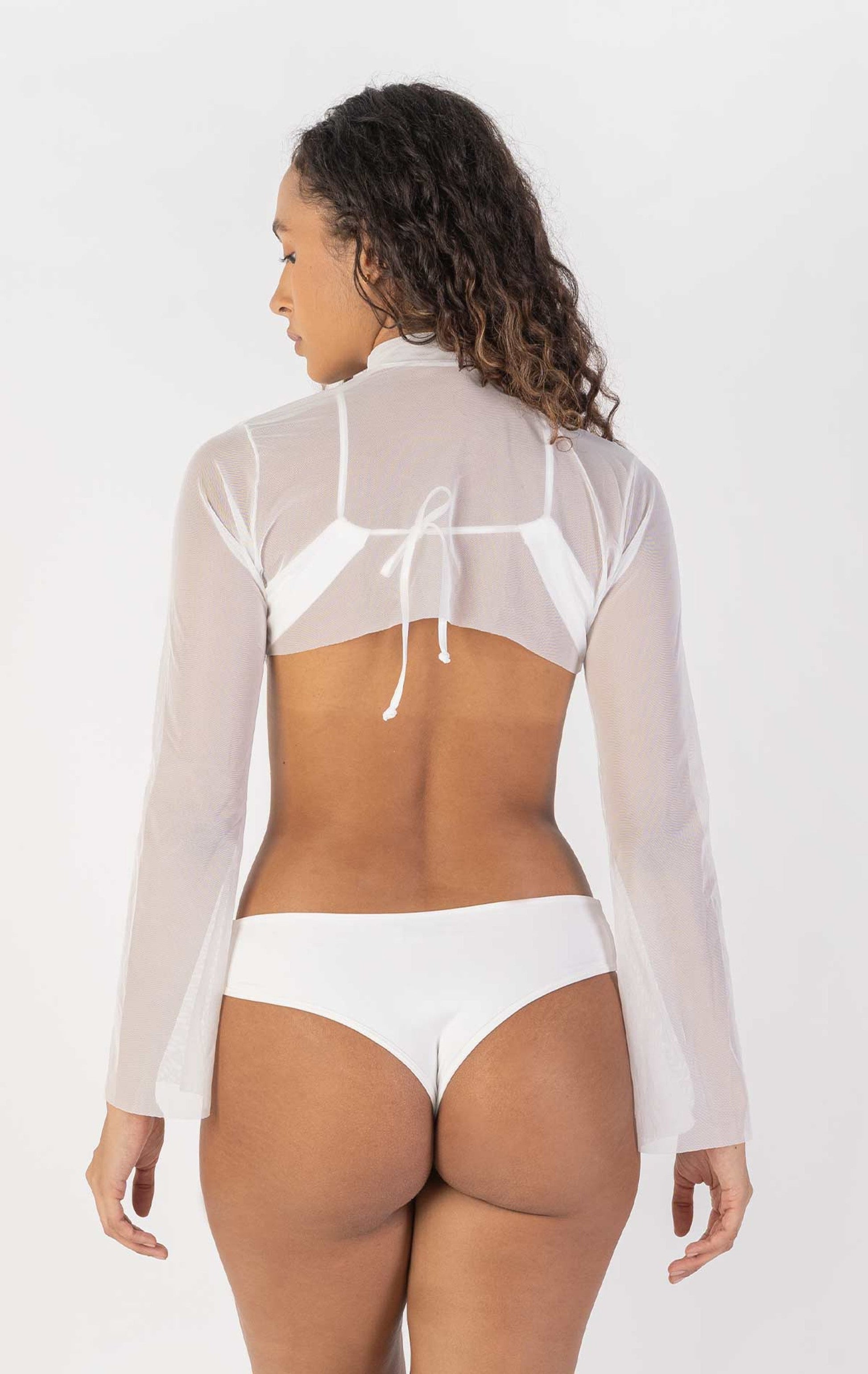 Buso corto de complemento, cuello alto y mangas largas tipo campana.