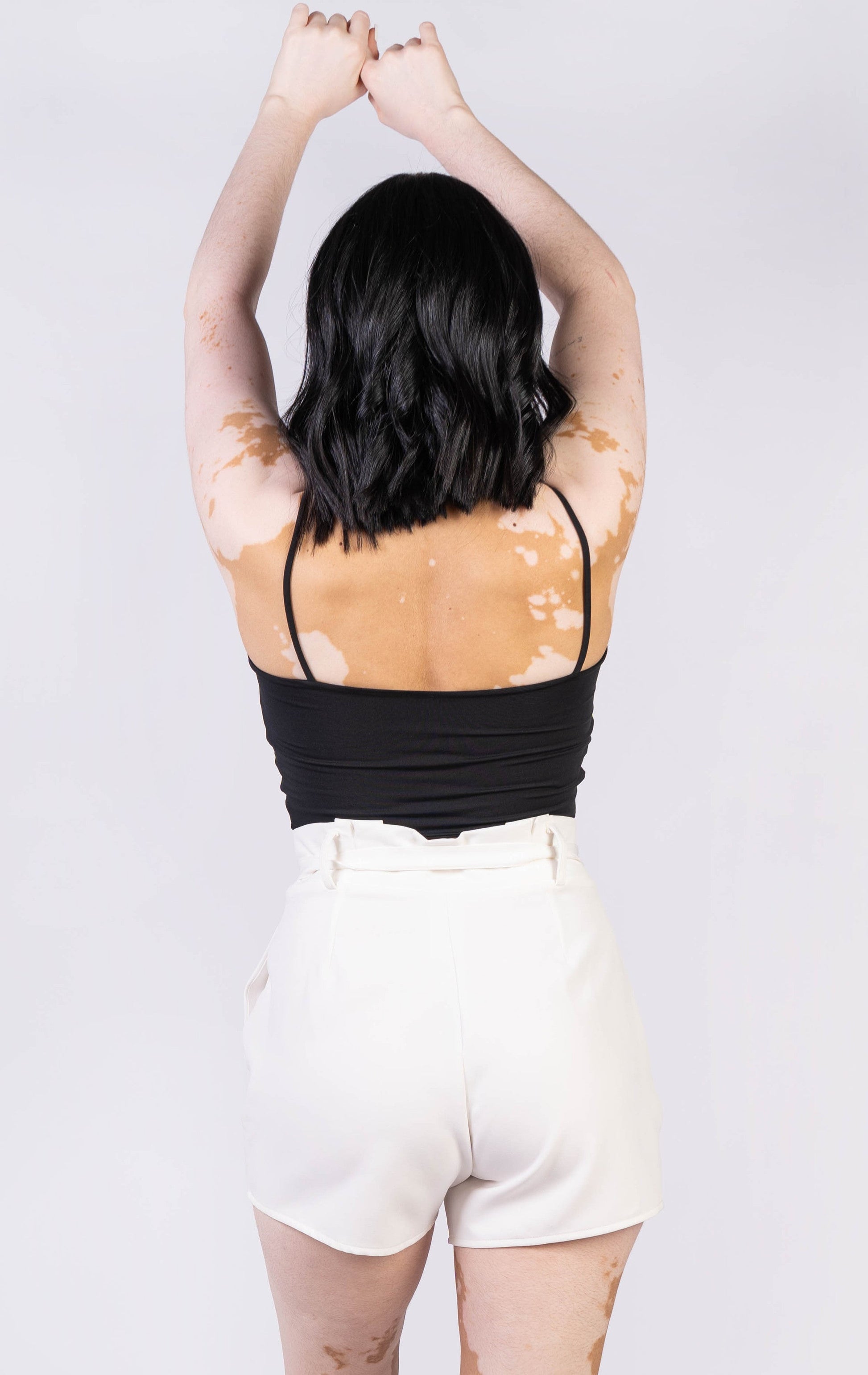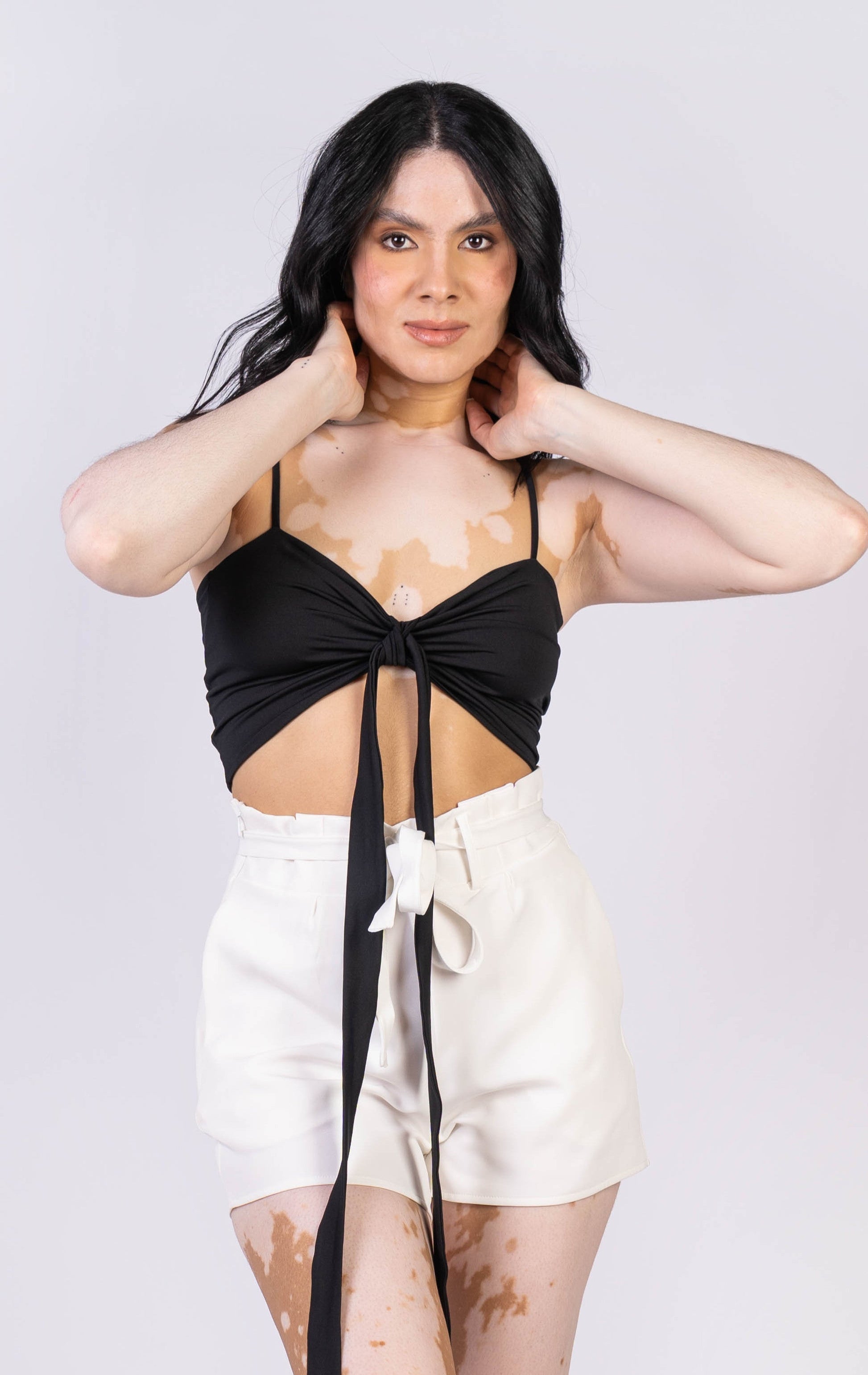 Crop top de tiras pitillo con escote profundo delantero y tiras largas.