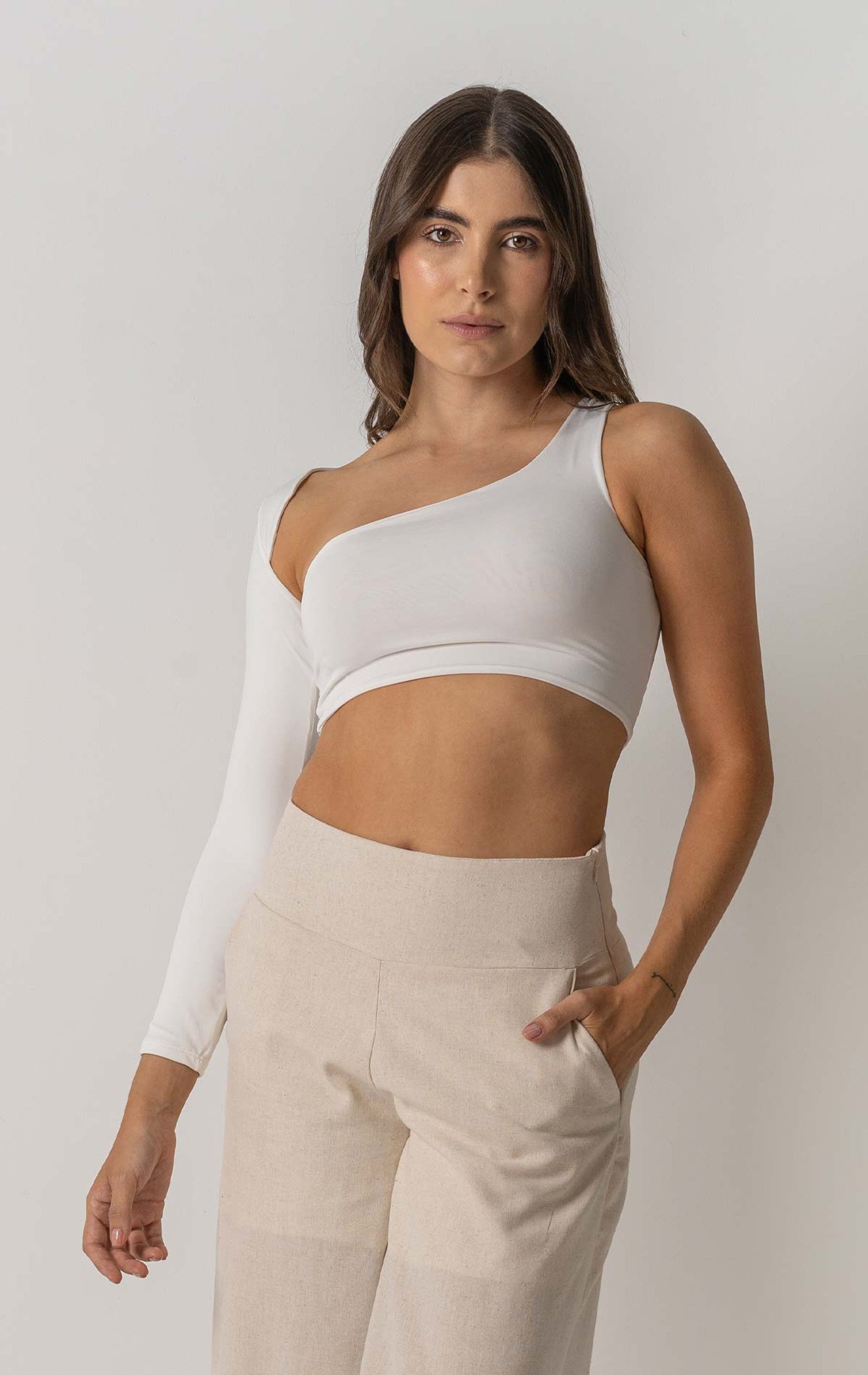 Crop top asimétrico de manga larga y escote posterior.