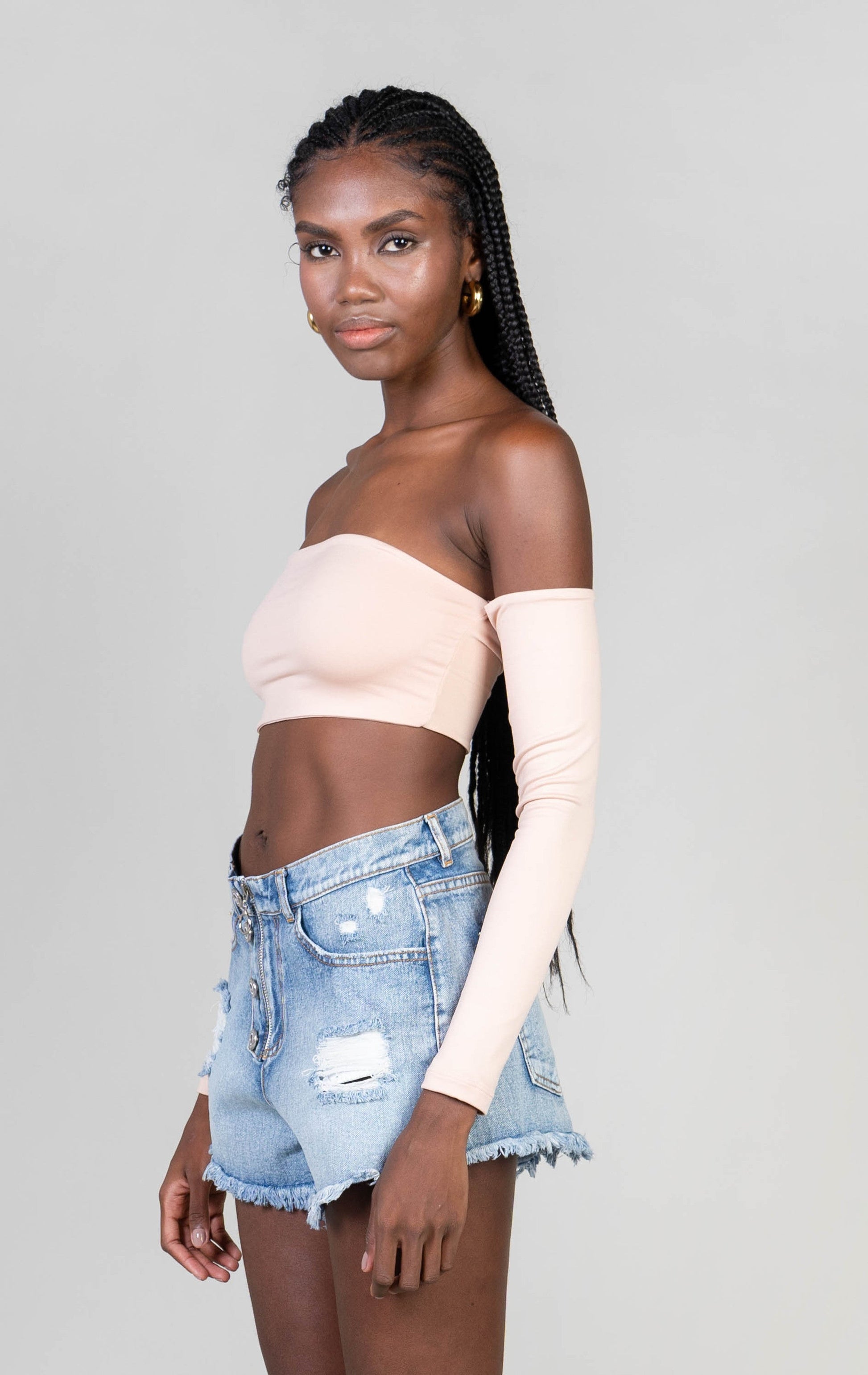 Crop top de corte cuadrado de mangas largas y hombros descubiertos.