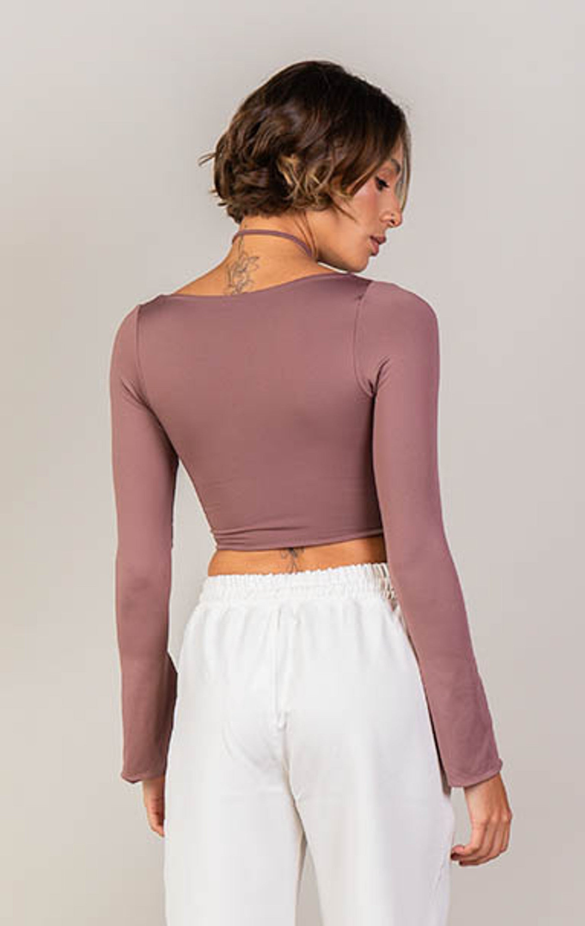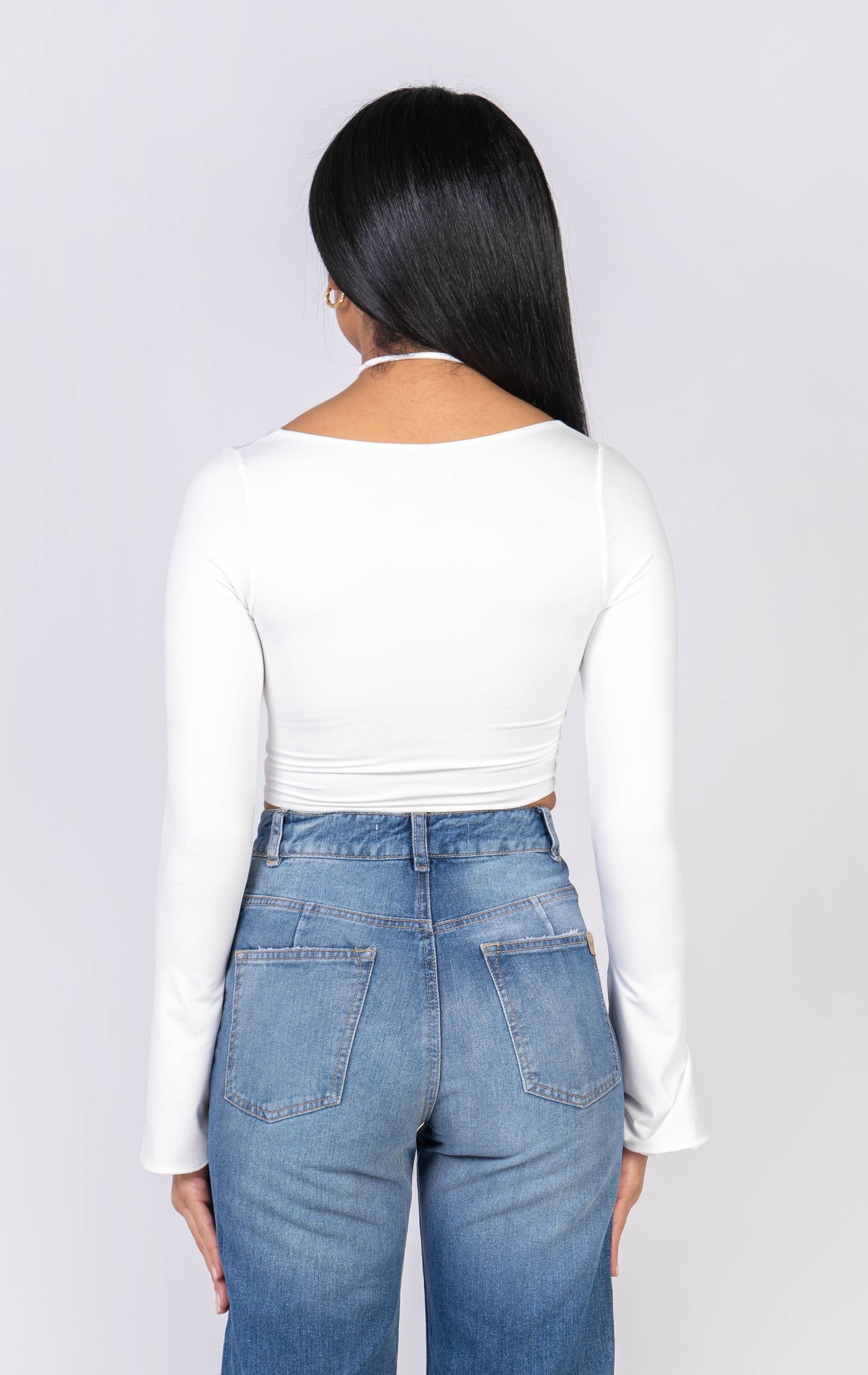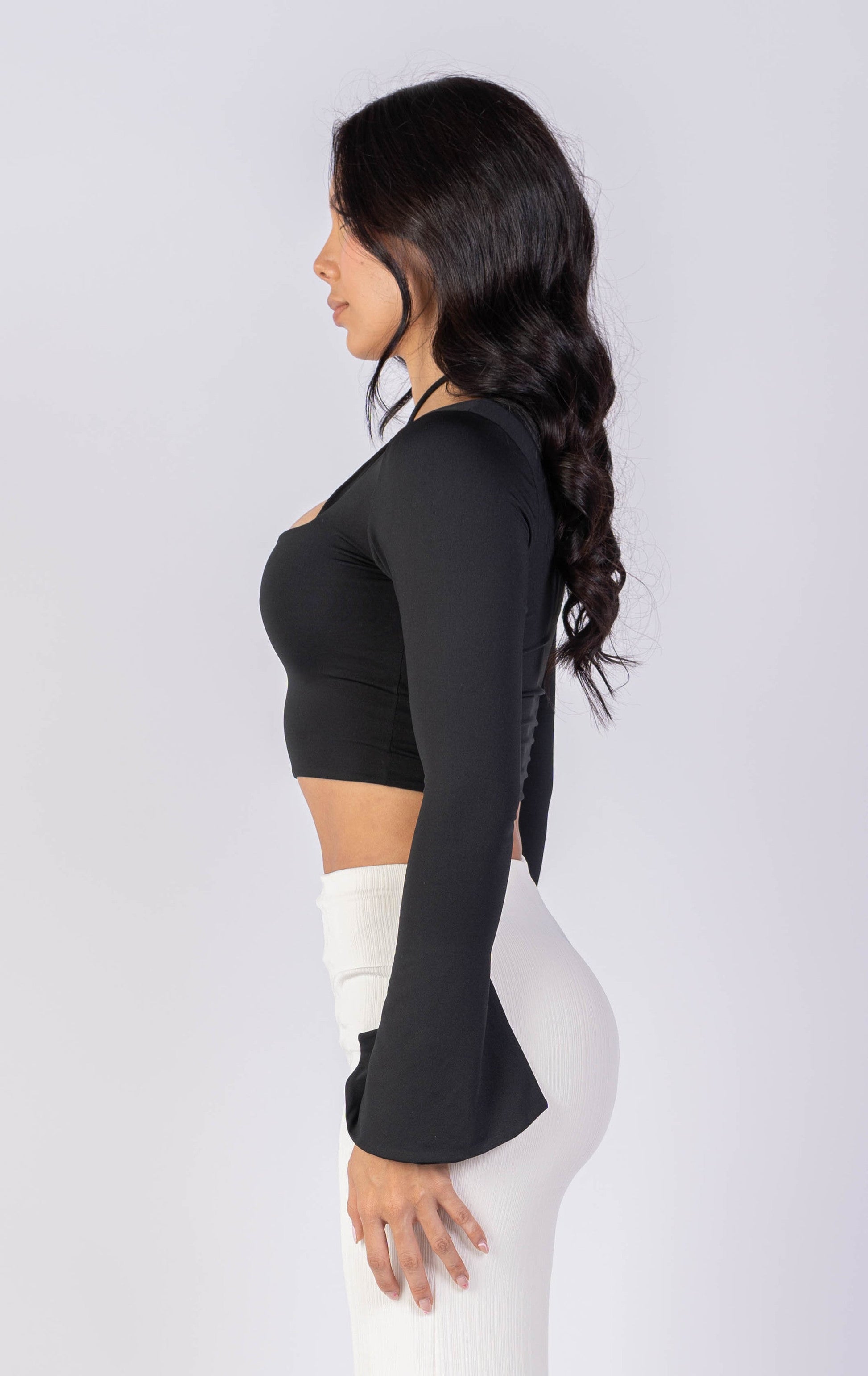 Crop top de mangas largas tipo campana con escote cuadrado y tiras envolventes en el cuello.