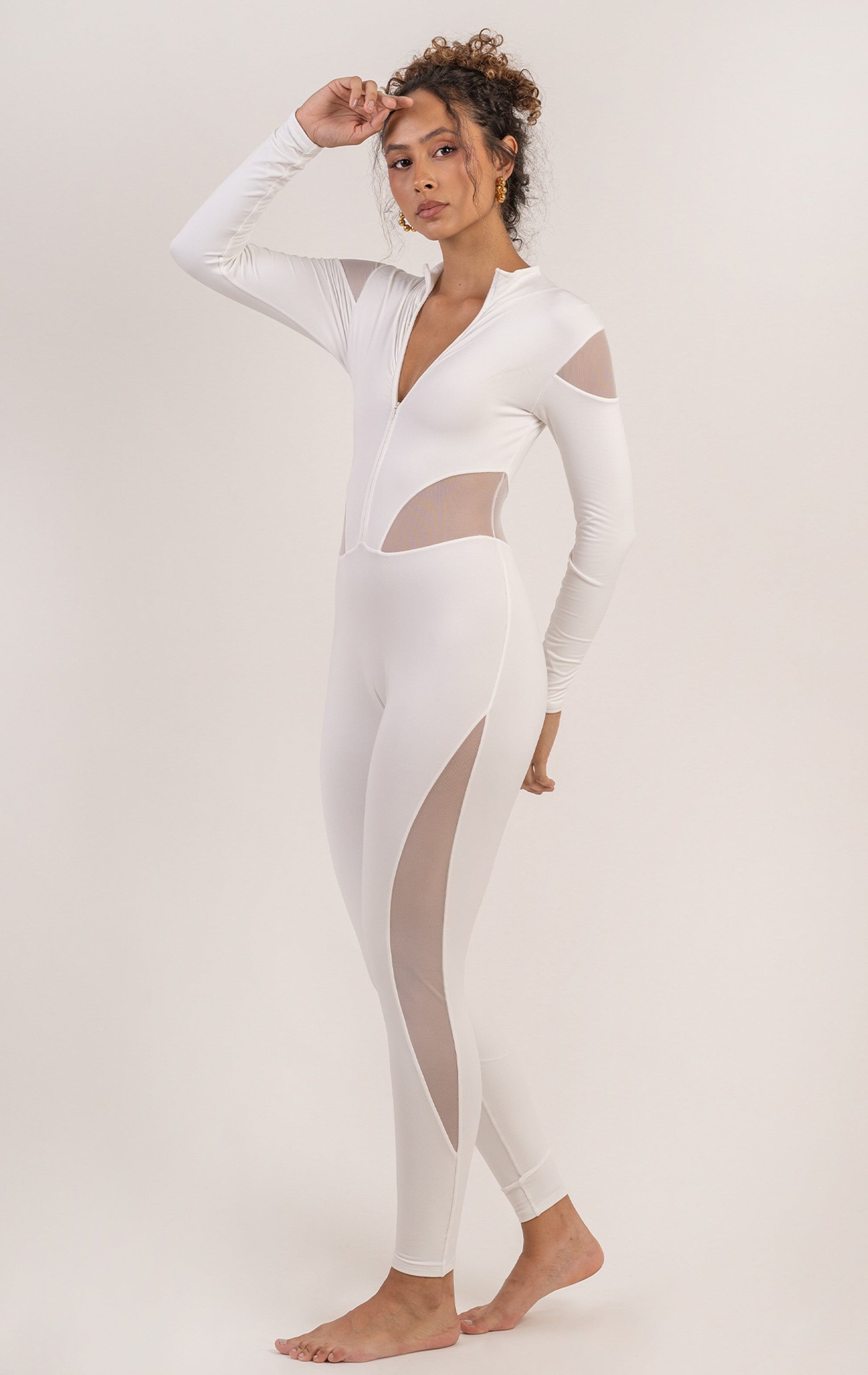 Enterizo mangas largas, escote con cremallera y cuello, transparencia en costados y hombros.